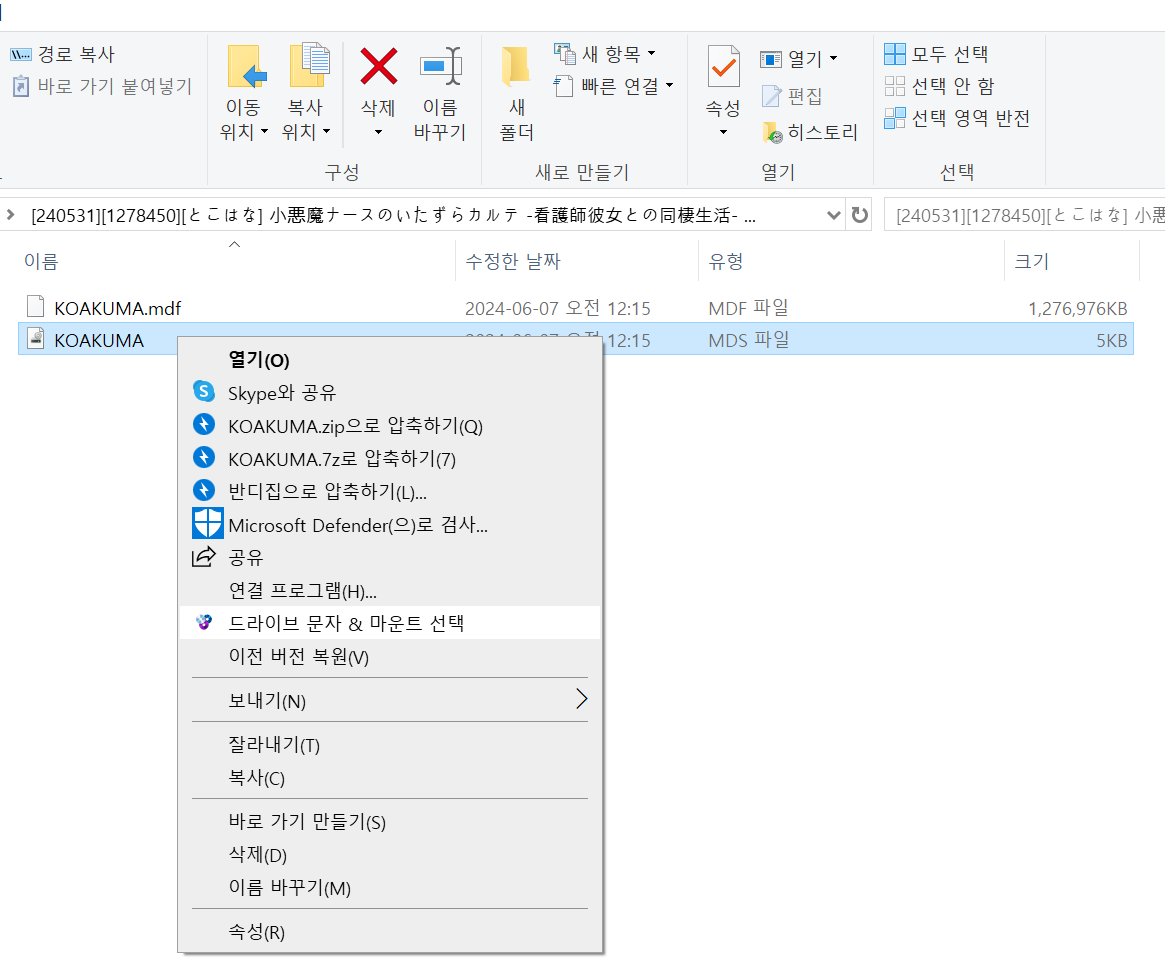 마운트하고자 하는 가상 이미지 파일을 우클릭하여 드라이브 문자 & 마운트 선택을 누릅니다.